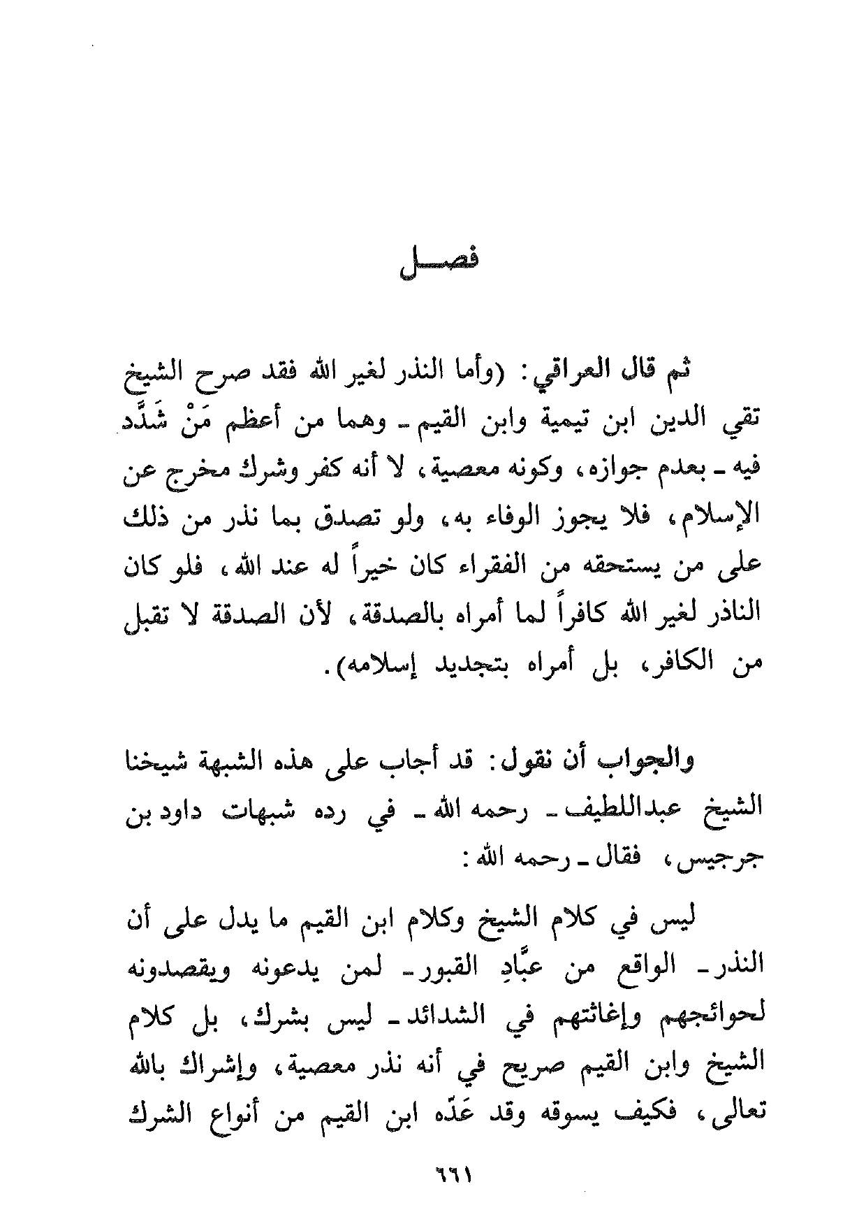 ليس في كلام الشيخ وكلام ابن القيم ما يدل على أن النذر -الواقع من عباد القبور- لمن يدعونه ويقصدونه لحوائجهم وإغاثتهم في الشدائد- ليس بشرك، بل كلام الشيخ وابن القيم صريح في أنه نذر معصية، وإشراك بالله تعالى، فكيف يسوقه وقد عده ابن القيم من أنواع الشرك