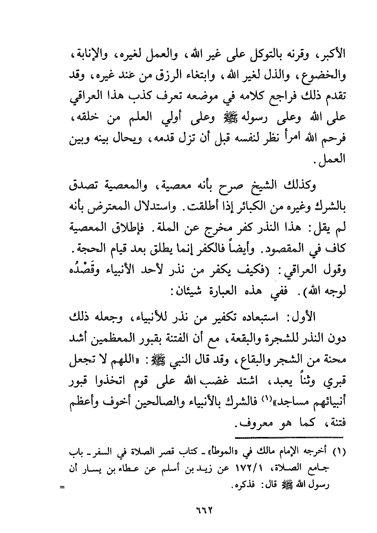 وكذلك الشيخ صرح بأنه معصية، والمعصية تصدق بالشرك وغيره من الكبائر إذا أطلقت. واستدلال المعترض بأنه لم يقل: هذا النذر كفر مخرج عن الملة. فإطلاق المعصية كاف في المقصود. وأيضاً فالكفر إنما يطلق بعد قيام الحجة. وقول العراقي: (فكيف يكفر من نذر لأحد الأنبياء وقصده لوجه الله) . ففي هذه العبارة شيئان: