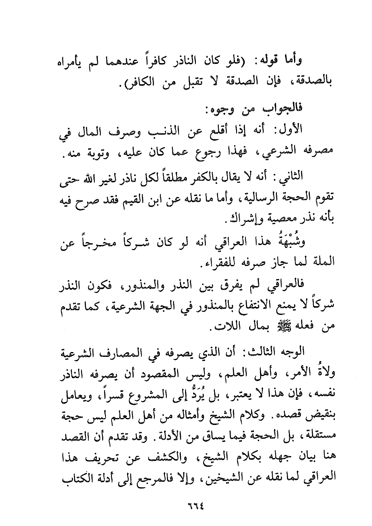 الوجه الثالث: أن الذي يصرفه في المصارف الشرعية، ولاة الأمر، وأهل العلم، وليس المقصود أن يصرفه الناذر نفسه، فإن هذا لا يعتبر، بل يرد إلى المشروع قسراً، ويعامل بنقيض قصده. وكلام الشيخ وأمثاله من أهل العلم ليس حجة مستقلة، بل الحجة فيما يساق من الأدلة. وقد تقدم أن القصد هنا بيان جهله بكلام الشيخ، والكشف عن تحريف هذا العراقي لما نقله عن الشيخين، وإلا فالمرجع إلى أدلة الكتاب