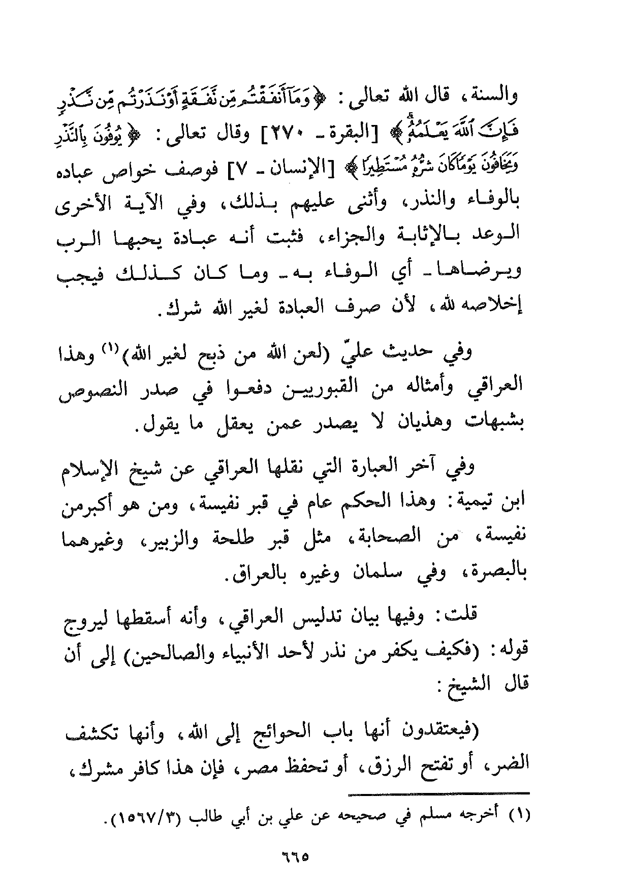 وفي حديث علي: "لعن الله من ذبح لغير الله" 1، وهذا العراقي وأمثاله من القبوريين دفعوا في صدر النصوص بشبهات وهذيان لا يصدر عمن يعقل ما يقول.