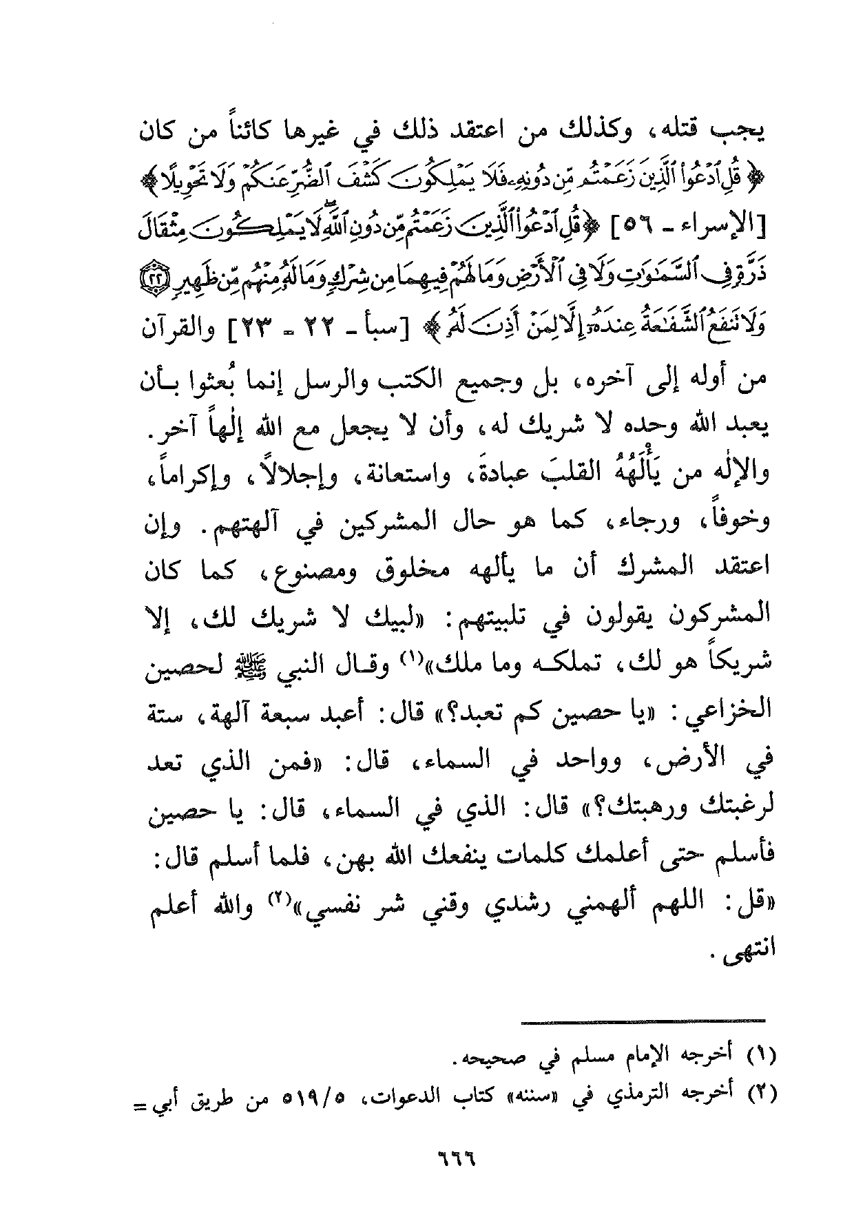 والإله من يألهه القلب عبادة واستعانة وإجلالاً وإكرماً، وخوفاً ورجاء، كما هو حال المشركين في آلهتهم. وإن اعتقد المشرك أن ما يألهه مخلوق ومصنوع، كما كان المشركون يقولون في تلبيتهم: "لبيك لا شريك لك، إلا شريكاً هو لك، تملكه وما ملك"1 وقال النبي صلى الله عليه وسلم لحصين الخزاعي: "يا حصين كم تعبد؟ " قال: أعبد سبعة آلهة، سنة في الأرض وواحد في السماء، قال: "فمن الذي تعد لرغبتك ورهبتك؟ " قال: الذي في السماء، قال: يا حصين فأسلم حتى أعلمك كلمات ينفعك الله بهن، فلما أسلم قال: "قل: اللهم ألهمني رشدي وقني شر نفسي" 2 والله أعلم انتهى.