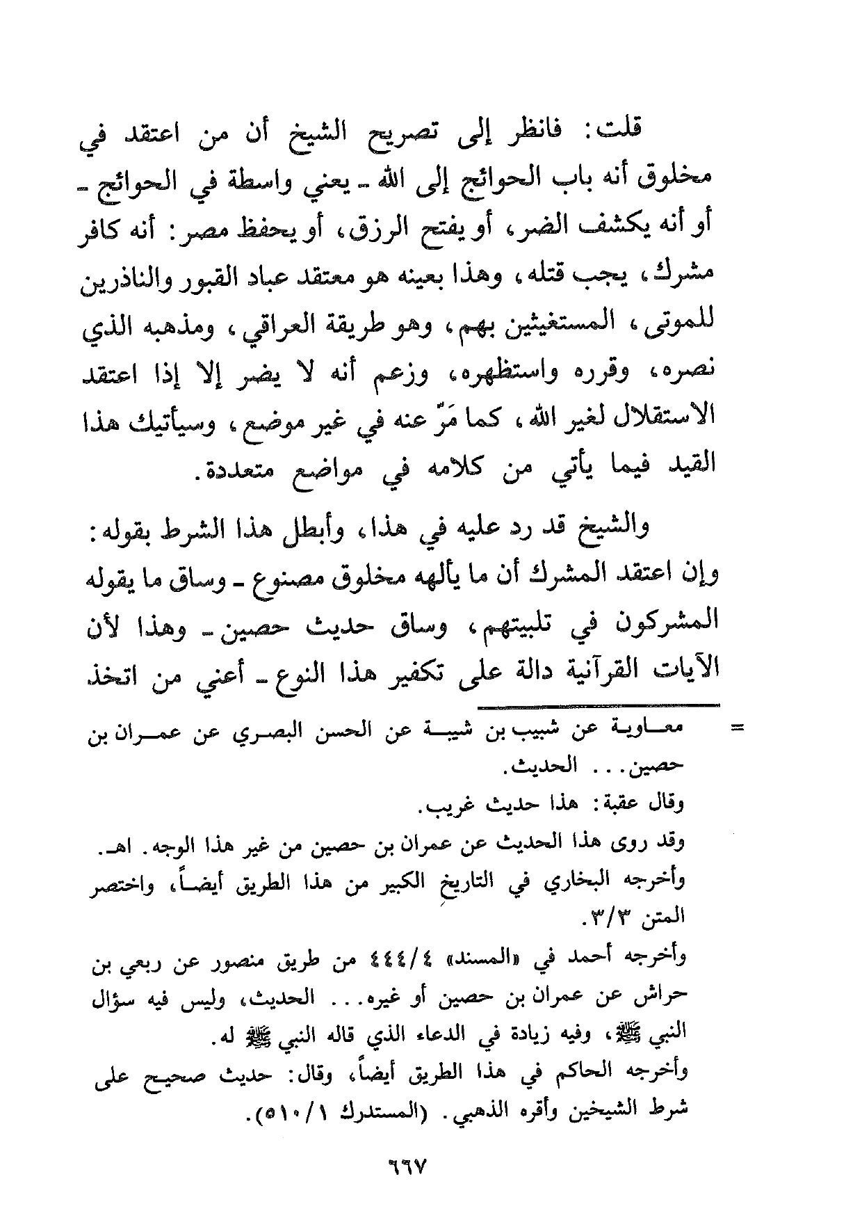 قلت: فانظر إلى تصريح الشيه أن من اعتقد في مخلوق أنه باب الحوائج إلى الله -يعني واسطة في الحوائج- أو أنه يكشف الضر، أو يفتح الرزق، أو يحفظ مصر: أنه كافر مشرك، يجب قتله، وهذا بعينه معتقد عباد القبور والناذرين للموتى، المستغيثين بهم، وهو طريقة العراقي، ومذهبه الذي نصره، وقرره واستظهره، وزعم أنه لا يضر إلا إذا اعتقد الاستقلال لغير الله، كما مر عنه في غير موضع، وسيأتيك هذا القيد فيما يأتي من كلامه في مواضع متعددة.