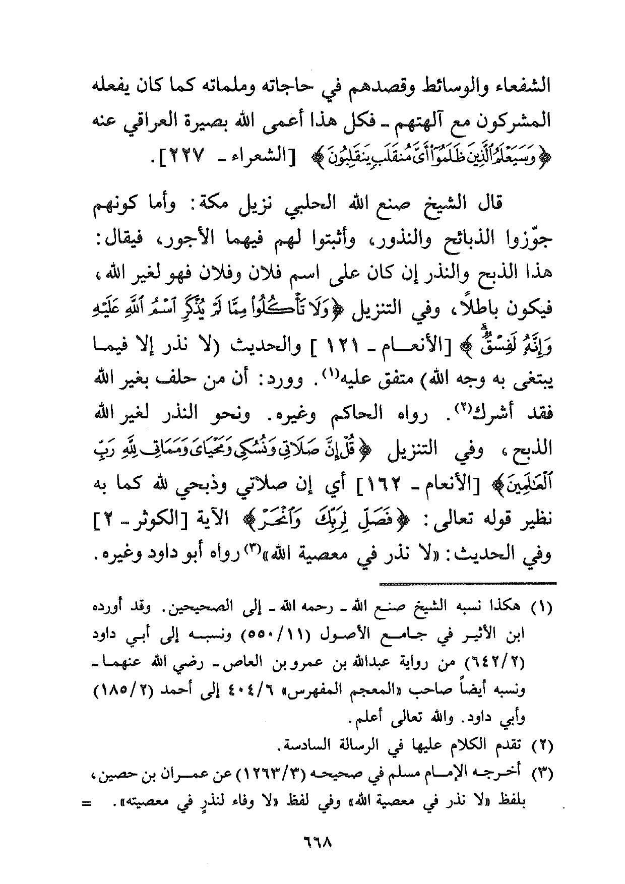 قال الشيخ صنع الله الحلبي نزيل مكة: وأما كونهم جوزوا الذبائح والنذور، وأثبتوا لهم فيهما الأجور، فيقال: هذا الذبح والنذر إن كان على اسم فلان وفلان فهو لغير الله، فيكون باطلاً، وفي التنزيل: {وَلا تَأْكُلُوا مِمَّا لَمْ يُذْكَرِ اسْمُ اللَّهِ عَلَيْهِ وَإِنَّهُ لَفِسْقٌ} [الأنعام: 121] ، والحديث: "لا نذر إلا فيما يبتغى به وجه الله" متفق عليه1. وورد: أن من حلف بغير الله فقد أشرك2. رواه الحاكم وغيره. ونحو النذر لغير الله الذبح، وفي التنزيل: {قُلْ إِنَّ صَلاتِي وَنُسُكِي وَمَحْيَايَ وَمَمَاتِي لِلَّهِ رَبِّ الْعَالَمِينَ} [الأنعام:162] ، أي إن صلاتي وذبحي لله كما به نظير قوله تعالى: {فَصَلِّ لِرَبِّكَ وَانْحَرْ} الآية [الكوثر:2] ، وفي الحديث: "لا نذر في معصية الله "3 رواه أبو داود وغيره.