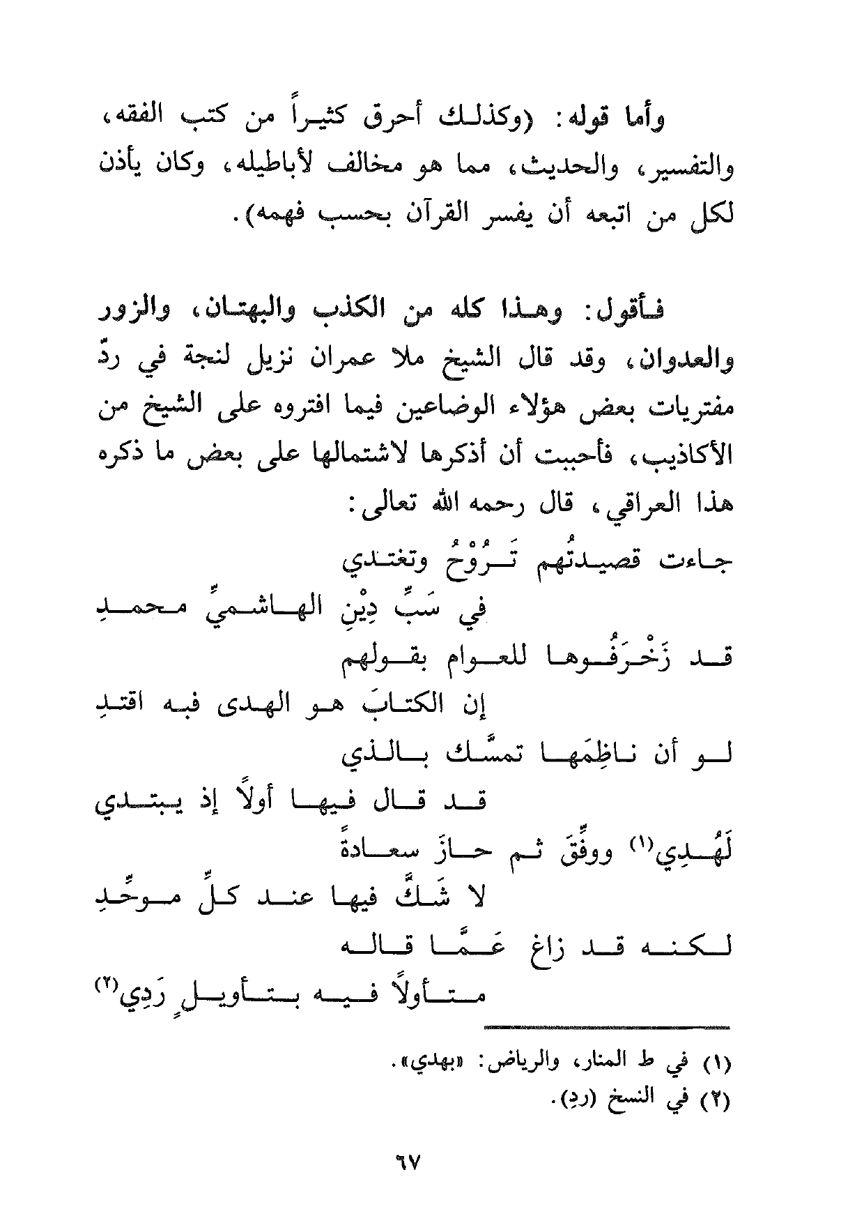 فأقول: وهذا كله من الكذب والبهتان، والزور والعدوان، وقد قال الشيخ ملا عمران نزيل لنجة في رد مفتريات بعض هؤلاء الوضاعين فيما افتروه على الشيخ من الأكاذيب، فأحببت أن أذكرها لاشتمالها على بعض ما ذكره هذا العراقي، قال رحمه الله تعالى:
