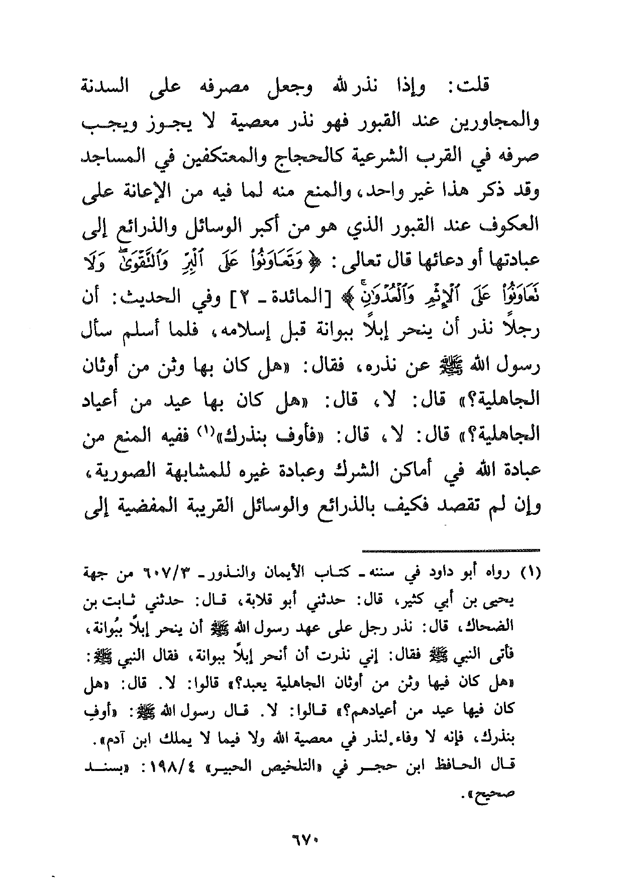 1 رواه أبو داود في سننه –كتاب الأيمان والنذور- 3/607 من جهة يحيى بن أبي كثير، قال: حدثني أبو قلابة، قال: حدثني ثابت بن الضحاك قال: نذر رجل على عهد رسول الله صلى الله عليه وسلم أن ينحر إبلاً ببوانة، فأتى النبي صلى الله عليه وسلم فقال: إني نذرت أن أنحر إبلاً ببوانة، فقال النبي صلى الله عليه وسلم: هل كان فيها وثن من أوثان الجاهلية يعبد؟ " قالوا: لا. قال: "هل كان فيها عيد من أعيادهم؟ " قالوا: لا، قال رسول الله صلى الله عليه وسلم: "أوف بنذرك، فإنه لا وفاء لنذر في معصية الله ولا فيما لا يملك ابن آدم".