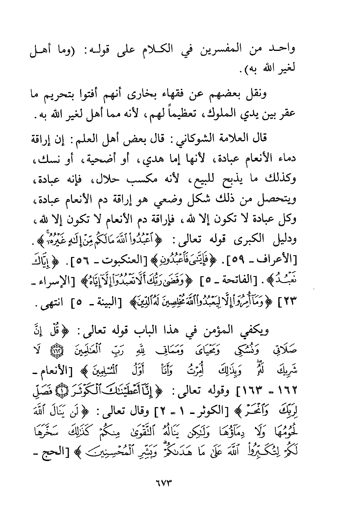 قال العلامة الشوكاني: قال بعض أهل العلم: إن إراقة دماء الأنعام عبادة، لأنها إما هدي، أو أضحية، أو نسك، وكذلك ما يذبح للبيع، لأنه مكسب حلال، فإنه عبادة، ويتحصل من ذلك شكل وضعي هو إراقة دم الأنعام عبادة، وكل عبادة لا تكون إلا لله، فإراقة دم الأنعام لا تكون إلا لله، ودليل الكبرى قوله تعالى: {اعْبُدُوا اللَّهَ مَا لَكُمْ مِنْ إِلَهٍ غَيْرُهُ} [الأعراف: 59] ، {فَإِيَّايَ فَاعْبُدُونِ} [العنكبوت: 56] . {إِيَّاكَ نَعْبُدُ} [الفاتحة:5] {وَقَضَى رَبُّكَ أَلَّا تَعْبُدُوا إِلَّا إِيَّاهُ} [الإسراء: 23] {وَمَا أُمِرُوا إِلَّا لِيَعْبُدُوا اللَّهَ مُخْلِصِينَ لَهُ الدِّينَ} [البينة: 5] انتهى.