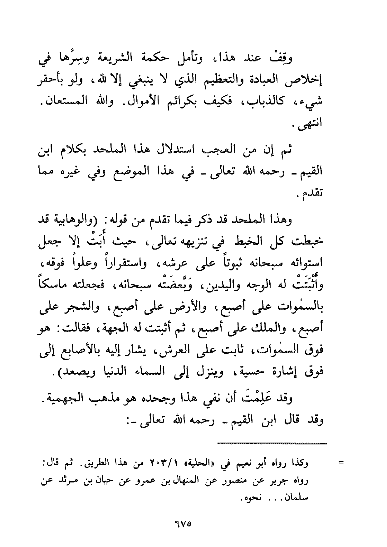 وهذا الملحد قد ذكر فيما تقدم من قوله: (والوهابية قد خبطت كل الخبط في تنزيهه تعالى، وحيث أبت إلا جعل استوائه سبحانه ثبوتاً على عرشه، واستقراراً وعلواً فوقه، وأثبتت له الوجه واليدين، وبعضته سبحانه، فجعلته ماسكاً بالسموات على أصبع، والأرض على أصبع والشجر على أصبع، والملك على أصبع، ثم أثبتت له الجهة، فقالت: هو فوق السموات، ثابت على العرش، يشار إليه بالأصابع إلى فوق إشارة حسية، وينزل إلى السماء الدنيا ويصعد) .