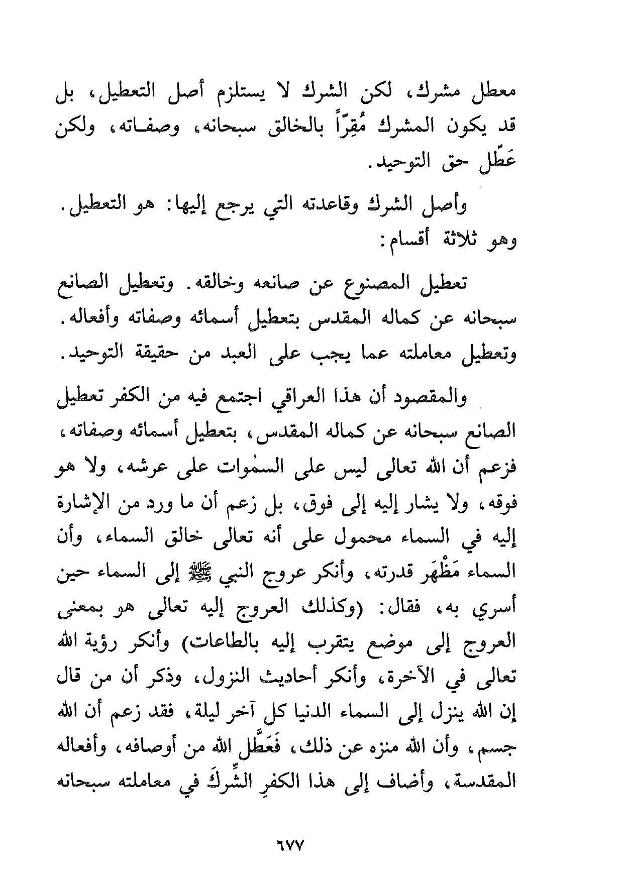 والمقصود أن هذا العراقي اجتمع فيه من الكفر تعطيل الصانع سبحانه عن كماله المقدس، بتعطيل أسمائه وصفاته، فزعم أن الله تعالى ليس على السموات على عرشه، ولا هو فوقه، ولا يشار إليه إلى فوق، بل زعم أن ما ورد من الإشارة إليه في السماء محمول على أنه تعالى خالق السماء، وأن السماء مظهر قدرته، وأنكر عروج النبي صلى الله عليه وسلم إلى السماء حين أسري به، فقال: (وكذلك العروج إليه تعالى هو بمعنى العروج إلى موضع بتقرب إليه بالطاعات) وأنكر رؤية الله تعالى في الآخرة، وأنكر أحاديث النزول، وذكر أن من قال إن الله ينزل إلى السماء الدنيا كل آخر ليلة، فقد زعم أن الله جسم، وأن الله منزه عن ذلك، فعطل الله من أوصافه وأفعاله المقدسة، وأضاف إلى هذا الكفر الشرك في معاملته سبحانه