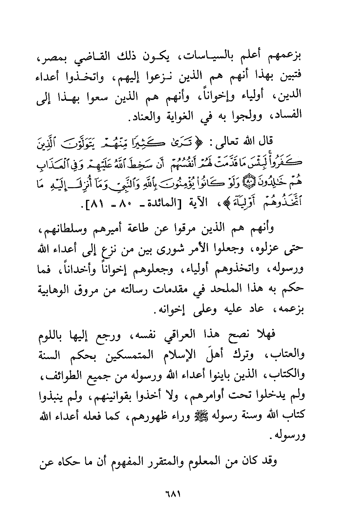 فهلا نصح هذا العراقي نفسه، ورجع إليها باللوم والعتاب، وترك أهل الإسلام المتمسكين بحكم السنة والكتاب، الذين باينوا أعداء الله ورسوله من جميع الطوائف، ولم يدخلوا تحت أوامرهم، ولا أخذوا بقوانينهم، ولم ينبذوا كتاب الله وسنة رسوله صلى الله عليه وسلم وراء ظهورهم، كما فعله أعداء الله ورسوله.