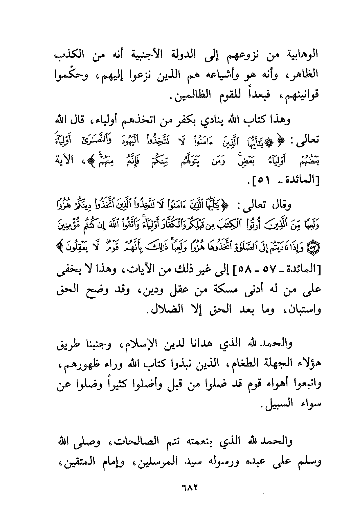 وقال تعالى: {يَا أَيُّهَا الَّذِينَ آمَنُوا لا تَتَّخِذُوا الَّذِينَ اتَّخَذُوا دِينَكُمْ هُزُواً وَلَعِباً مِنَ الَّذِينَ أُوتُوا الْكِتَابَ مِنْ قَبْلِكُمْ وَالْكُفَّارَ أَوْلِيَاءَ وَاتَّقُوا اللَّهَ إِنْ كُنْتُمْ مُؤْمِنِينَ. وَإِذَا نَادَيْتُمْ إِلَى الصَّلاةِ اتَّخَذُوهَا هُزُواً وَلَعِباً ذَلِكَ بِأَنَّهُمْ قَوْمٌ لا يَعْقِلُونَ} [المائدة: 57-58] إلى غير ذلك من الآيات، وهذا لا يخفى على من له أدنى مسكة من عقل ودين، وقد وضح الحق واستبان، وما بعد الحق إلا الضلال.