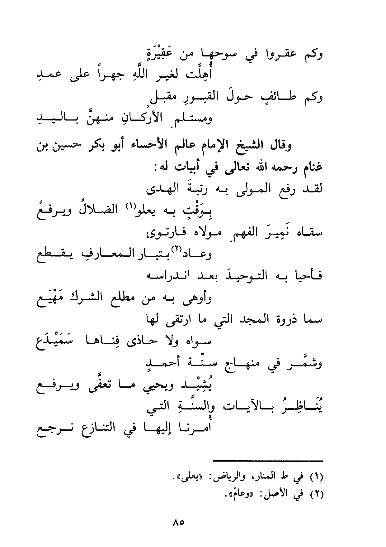 وقال الشيخ الإمام عالم الأحساء أبو بكر حسين بن غنام رحمه الله تعالى في أبيات له: