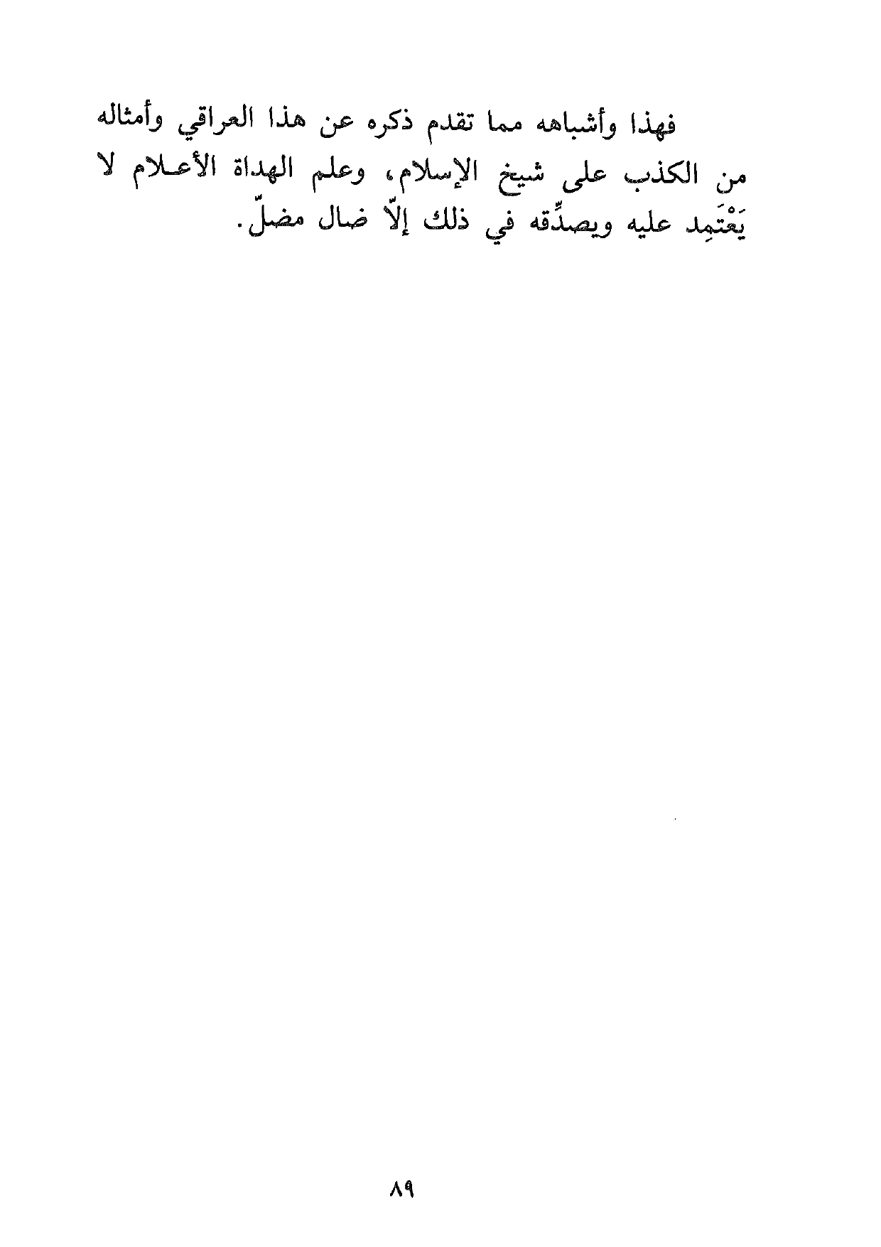 فهذا وأشباهه مما تقدم ذكره عن هذا العراقي وأمثاله من الكذب على شيخ الإسلام، وعلم الهداة الأعلام لا يعتمد عليه ويصدقه في ذلك إلا ضال مضلّ.