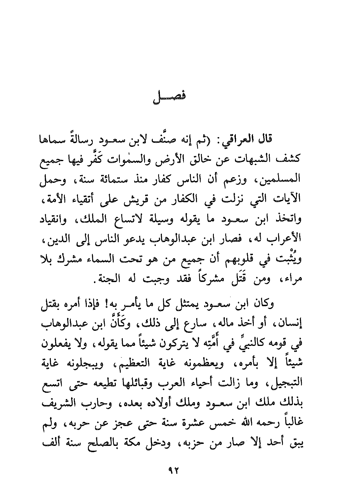 قال العراقي: (ثم إنه صنف لابن سعود رسالة سماها كشف الشبهات عن خالق الأرض والسموات كفّر فيها جميع المسلمين، وزعم أن الناس كفار منذ ستمائة سنة، وحمل الآيات التي نزلت في الكفار من قريش على أتقياء الأمة، واتخذ ابن سعود ما يقوله وسيلة لاتساع الملك، وانقياد الأعراب له، فصار ابن عبد الوهاب يدعو الناس إلى الدين، ويثبت في قلوبهم أن جميع من هو تحت السماء مشرك بلا مراء، ومن قتل مشركاً فقد وجبت له الجنة.