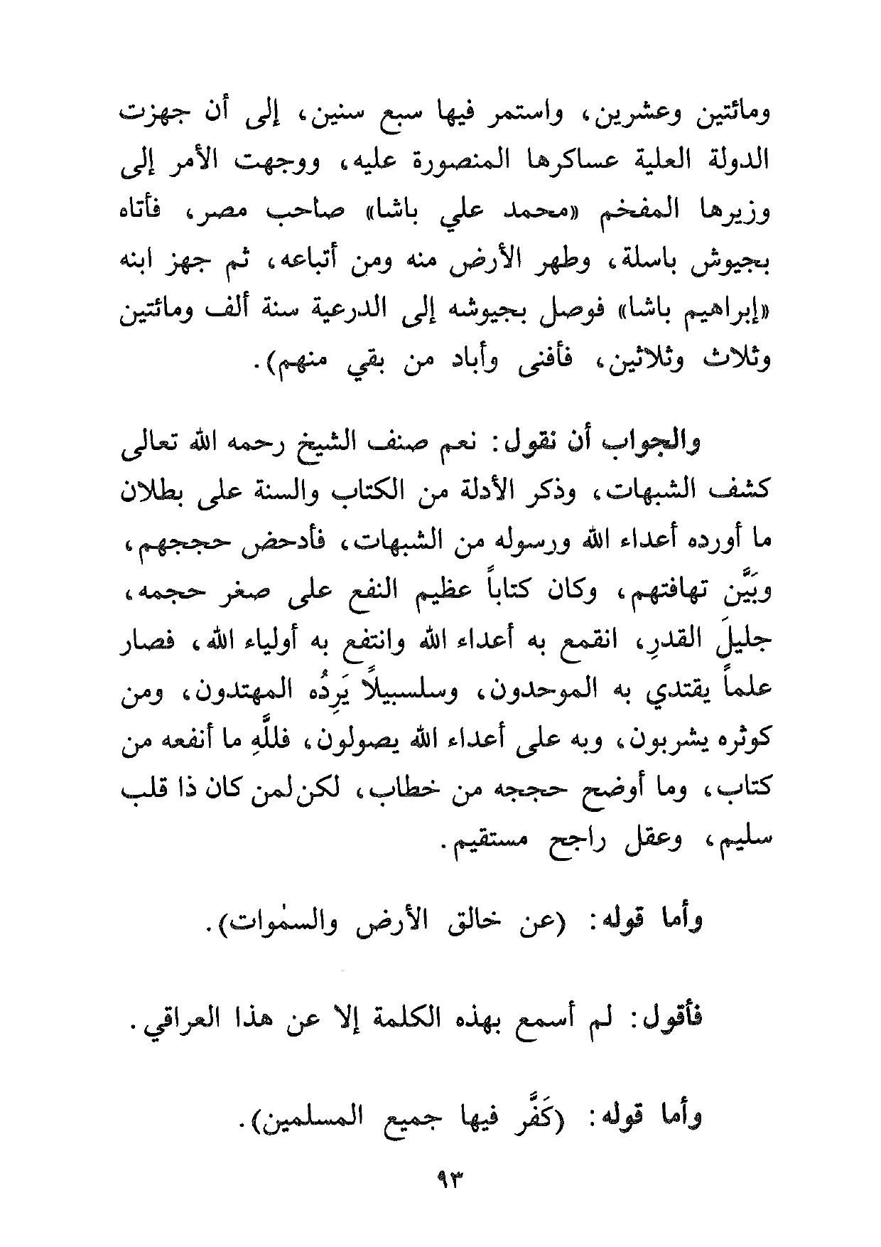 ومائتين وعشرين، واستمر فيها سبع سنين، إلى أن جهزت الدولة العلية عساكرها المنصورة عليه، ووجهت الأمر إلى وزيرها المفخم "محمد علي باشا" صاحب مصر، فأتاه بجيوش باسلة، وطهر الأرض منه ومن أتباعه، ثم جهز ابنه "إبراهيم باشا" فوصل بجيوشه إلى الدرعية سنة ألف ومائتين وثلاث وثلاثين، فأفنى وأباد من بقي منهم) .