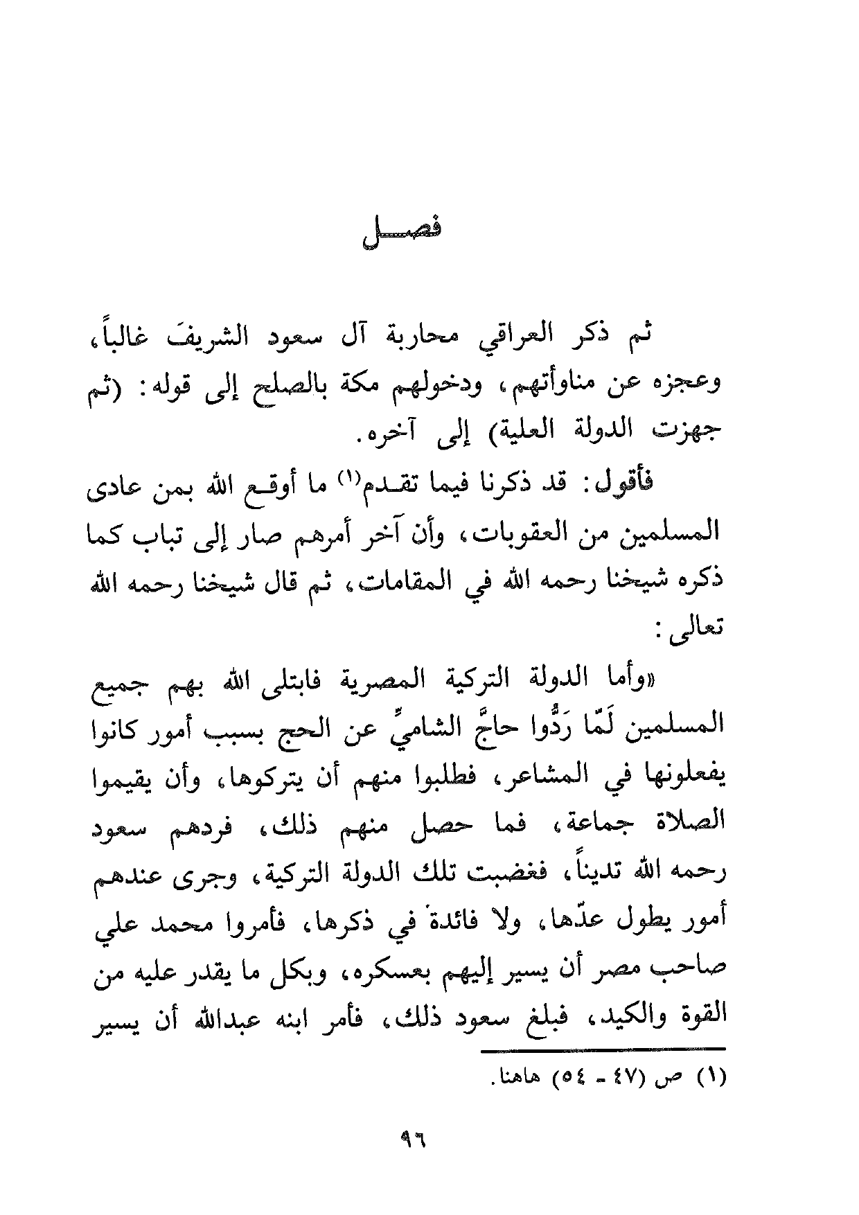 "وأما الدولة التركية المصرية فابتلى الله بهم جميع المسلمين لما ردوا حاج الشامي عن الحج بسبب أمور كانوا يفعلونها في المشاعر، فطلبوا منهم أن يتركوها، وأن يقيموا الصلاة جماعة، فما حصل منهم أن ذلك، فردهم سعود رحمه الله تديناً، فغضبت تلك الدولة التركية، وجرى عندهم أمور يطول عدها، ولا فائدة في ذكرها، فأمروا محمد علي صحاب مصر أن يسير إليهم بعسكره، وبكل ما يقدر عليه من القوة والكيد، فبلغ سعود ذلك، فأمر ابنه عبد الله أن يسير