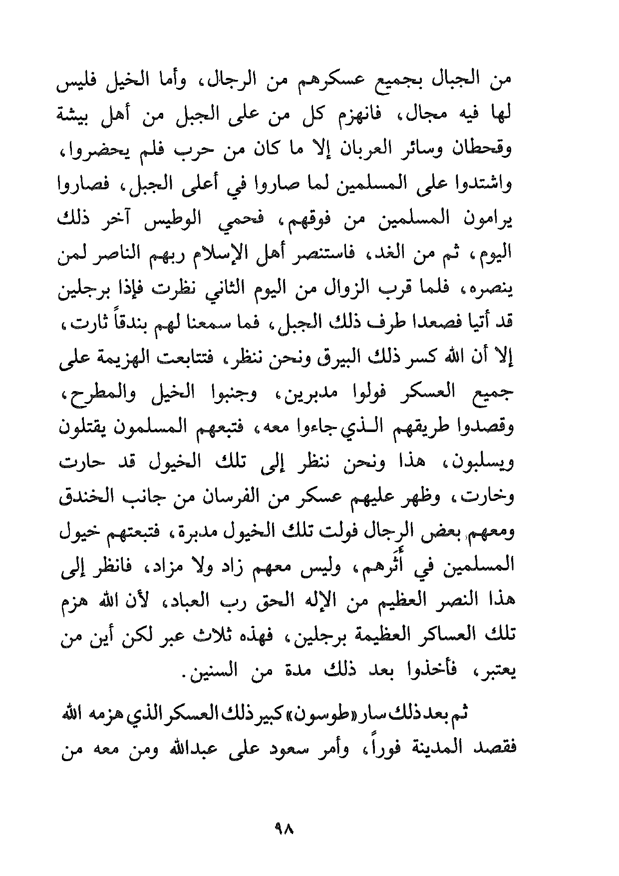 من الجبال بجميع عسكرهم من الرجال، وأما الخيل فليس لها فيه مجال، فانهزم كل من على الجبل من أهل بيشة وقحطان وسائر العربان إلا ما كان من حرب فلم يحضروا، واشتدوا على المسلمين لما صاروا في أعلى الجبل، فصاروا يرامون المسلمين من فوقهم، فحمي الوطيس آخر ذلك اليوم، ثم من الغد، فاستنصر أهل الإسلام ربهم الناصر لمن ينصره، فلما قرب الزوال من اليوم الثاني نظرت فإذا برجلين قد أتيا فصعدا طرف ذلك الجبل، فما سمعنا لهم بندقاً ثارت، إلا أن الله كسر ذلك البيرق ونحن ننظر، فتتابعت الهزيمة على جميع العسكر فولوا مدبرين، وجنبوا الخيل والمطرح، وقصدوا طريقهم الذي جاءوا معه، فتبعهم المسلمون يقتلون ويسلبون، هذا ونحن ننظر إلى تلك الخيول قد حارت وخارت، وظهر عليهم عسكر من الفرسان من جانب الخندق ومعهم بعض الرجال فولت تلك الخيول مدبرة، فتبعتهم خيول المسلمين في أثرهم، وليس معهم زاد ولا مزاد، فانظر إلى هذا النصر العظيم من الإله الحق رب العباد، لأن الله هزم تلك العساكر العظيمة برجلين، فهذه ثلاث عبر لكن أين من يعتبر، فأخذوا بعد ذلك مدة من السنين.