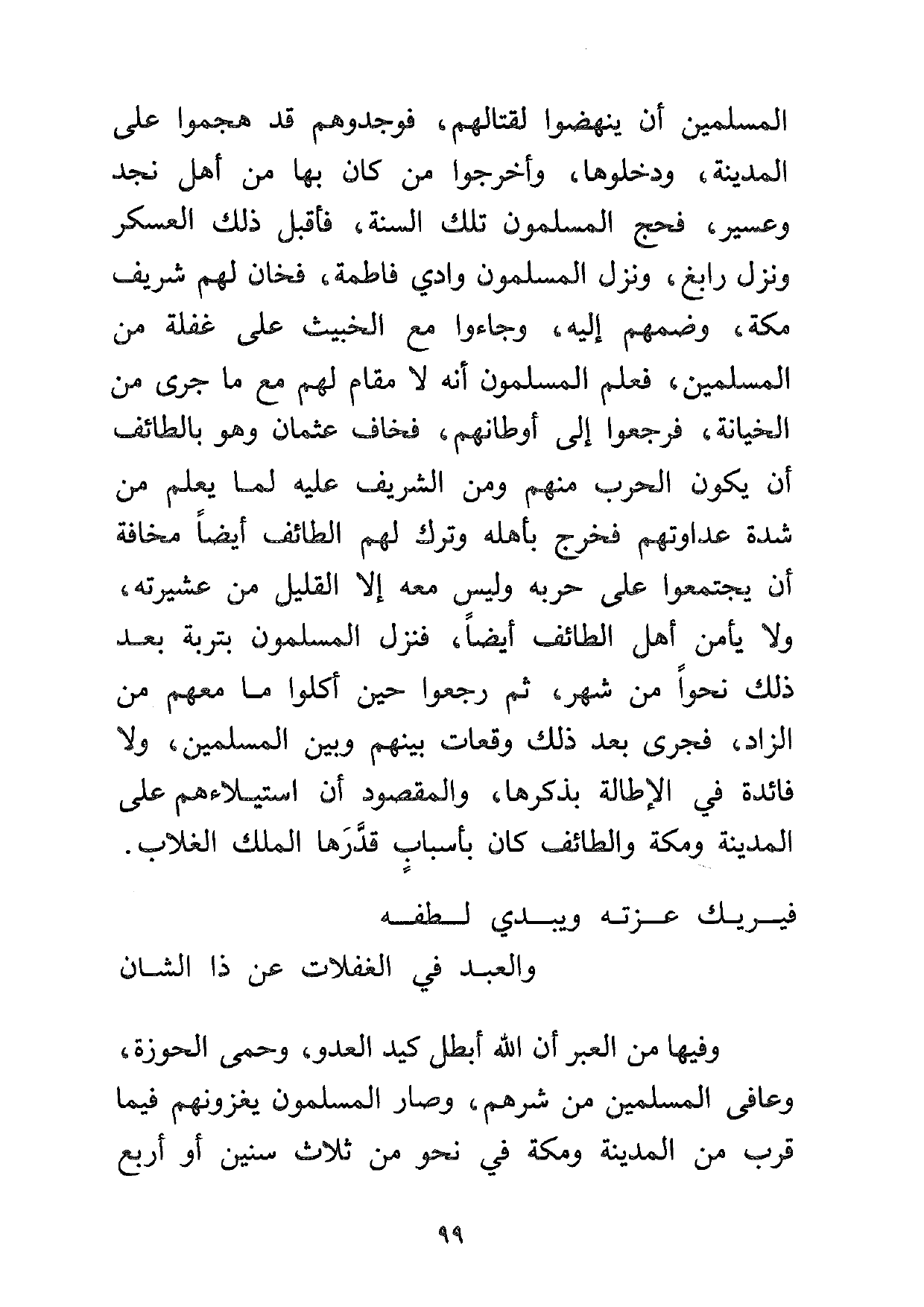 المسلمين أن ينهضوا لقتالهم، فوجدوهم قد هجموا على المدينة، ودخلوها، وأخرجوا من كان بها من أهل نجد وعسير، فحج المسلمون تلك السنة، فأقبل ذلك العسكر ونزل رابغ، ونزل المسلمون وادي فاطمة، فخان لهم شريف مكة، وضمهم إليه، وجاءوا مع الخبيث على غفلة من المسلمين، فعلم المسلمون أنه لا مقام لهم مع ما جرى من الخيانة، فرجعوا إلى أوطانهم، فخاف عثمان وهو بالطائف أن يكون الحرب منهم ومن الشريف عليه لما يعلم من شدة عداوتهم فخرج بأهله وترك لهم الطائف أيضاً مخافة أن يجتمعوا على حربه، وليس معه إلا القليل من عشيرته، ولا يأمن أهل الطائف أيضاً، فنزل المسلمون بتربة بعد ذلك نحوا من شهر، ثم رجعوا حين أكلوا ما معهم من الزاد، فجرى بعد ذلك وقعات بينهم وبين المسلمين، ولا فائدة في الإطالة بذكرها، والمقصود أن استيلاءهم على المدينة ومكة والطائف كان بأسباب قدّرها الملك الغلاب.