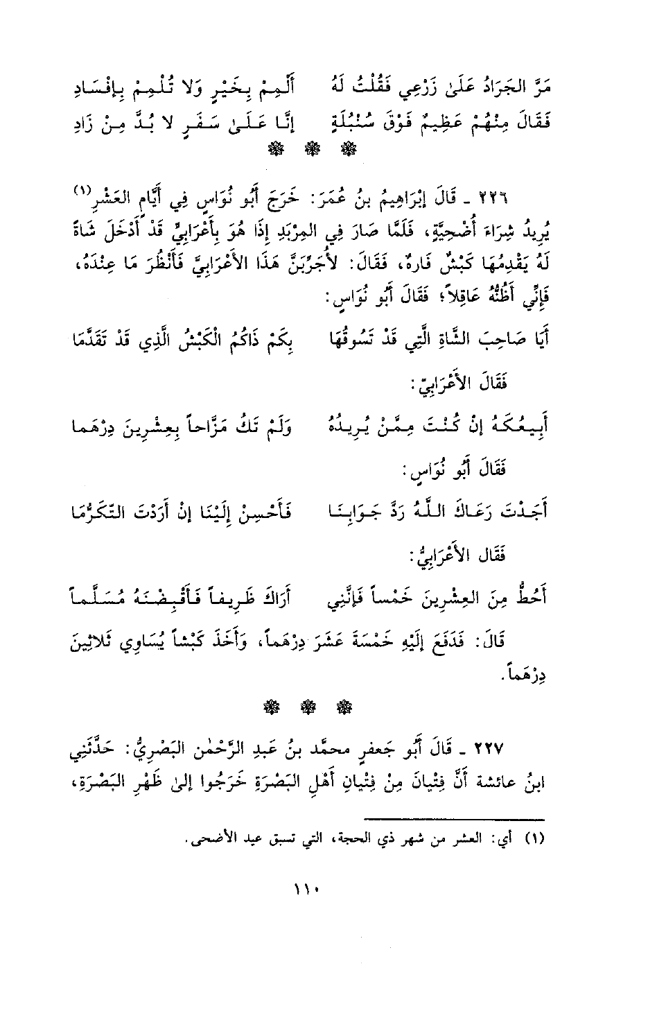 226 - قال إبراهيم بن عمر: خرج أبو نواس في أيّام العشر يريد شراءَ أضحيةٍ، فلمّا صار في المربد إذا هو بأعرابي قد أدخل شاةً له يقدمها كبشٌ فارهٌ، فقال: لأجرِّبنّ هذا الأعرابي فأنظر ما عنده، فإني أظنّه عاقلاً؛ فقال أبو نواسٍ: