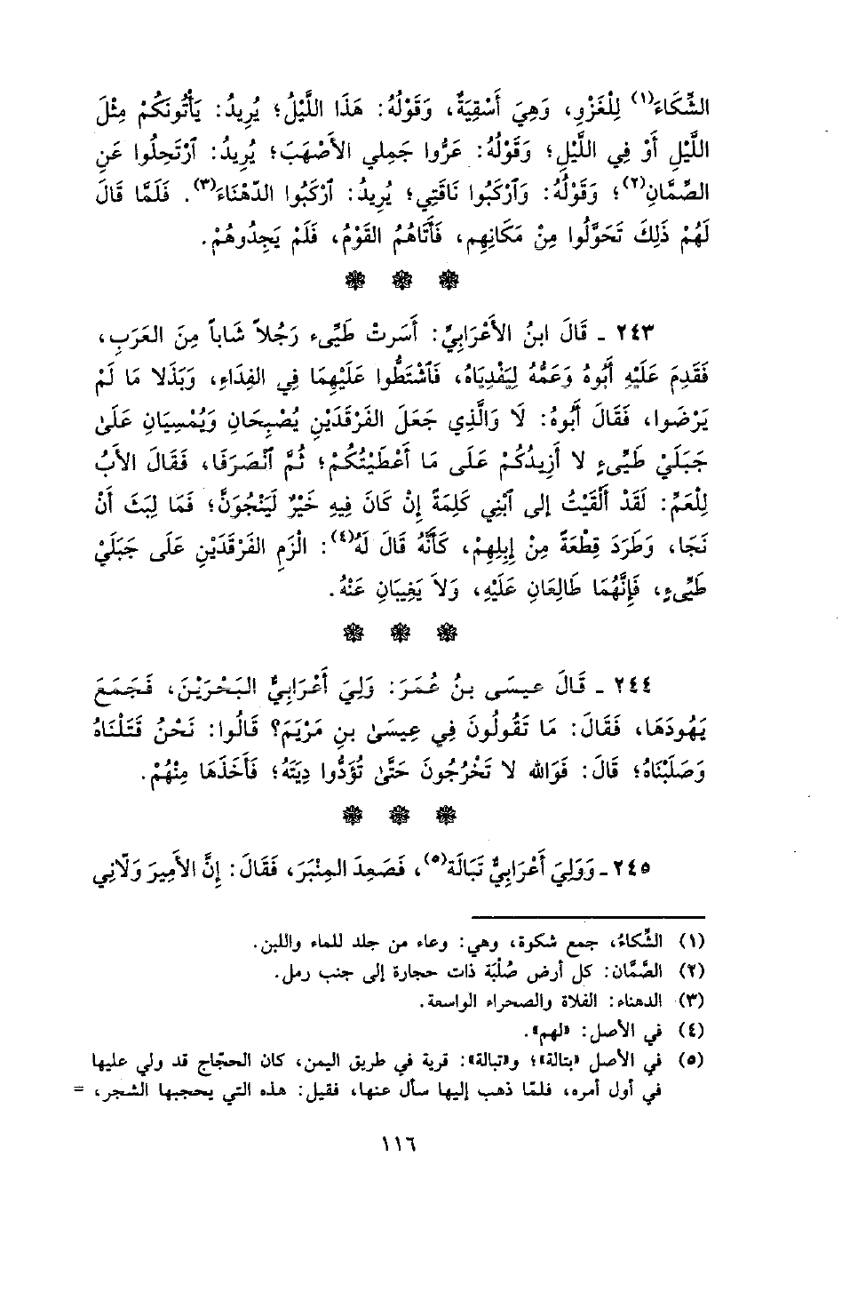 243 - قال ابن الأعرابي: أسرت طيىء رجلاً شاباً من العرب، فقدم عليه أبوه وعمّه ليفدياه، فاشتطوا عليهما في الفداء، وبذلاً ما لم يرضوا، فقال أبوه: لا والذي جعل الفرقدين يصبحان ويمسيان على جبلي طيىءٍ لا أزيدكم على ما أعطيتكم؛ ثمّ انصرفا، فقال الأب للعم: لقد ألقيت إلى ابني كلمةٌ إن كان فيه خيرٌ لينجونّ؛ فما لبث أن نجا، وطرد قطعةً من إبلهم، كأنّه قال له: الزم الفرقدين على جبلي طيىءٍ، فإنّهما طالعان عليه، ولا يغيبان عنه.