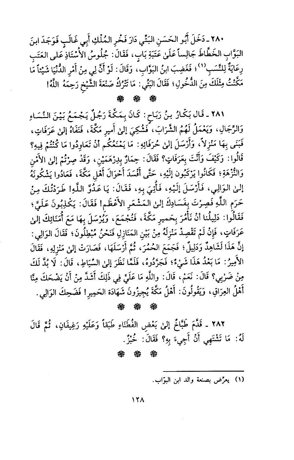 280 - دخل أبو الحسن البتّي دار فخر الملك أبي غالبٍ فوجد ابن البوّاب الخطاط جالساً على عتبة باب، فقال: جلوس الأستاذ على العتب رعايةٌ للنسب؛ فغضب ابن البوّاب، وقال: لو أن لي من أمر الدنيا شيئاً ما مكنت مثلك من الدخول؛ فقال البتي: ما تترك صنعة الشيخ رحمه الله {