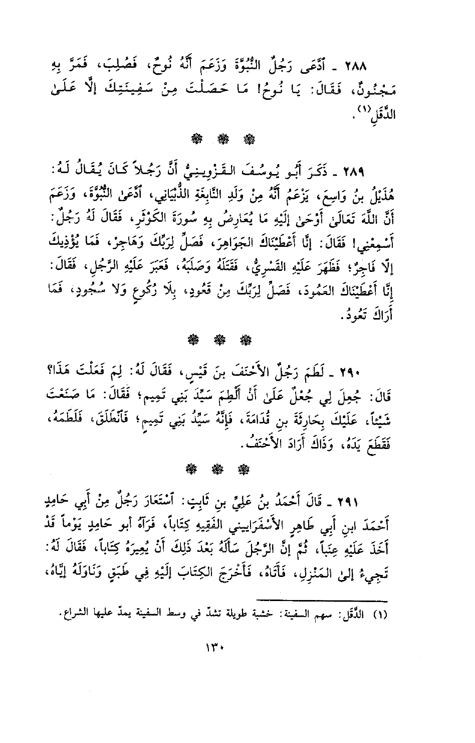 289 - ذكر أبو يوسف القزوينيُّ أنّ رجلاً كان يقال له: هذيل بن واسع، يزعم أنّه من ولد النّابغة الذبياني، ادّعى النبّوة، وزعم أن الله تعالى أوحى إليه ما يعارض به سورة الكوثر، فقال له رجلّ: أسمعني} فقال: إنّا أعطيناك الجواهر، فصل لربّك وهاجر، فما يؤذيك إلا فاجر؛ فظهر عليه القسري، فقتله وصلبه، فعبر عليه الرجل، فقال: إنّا أعطيناك العمود، فصلّ لربّك من قعود، بلا ركوعٍ ولا سجودٍ، فما أراك تعود.