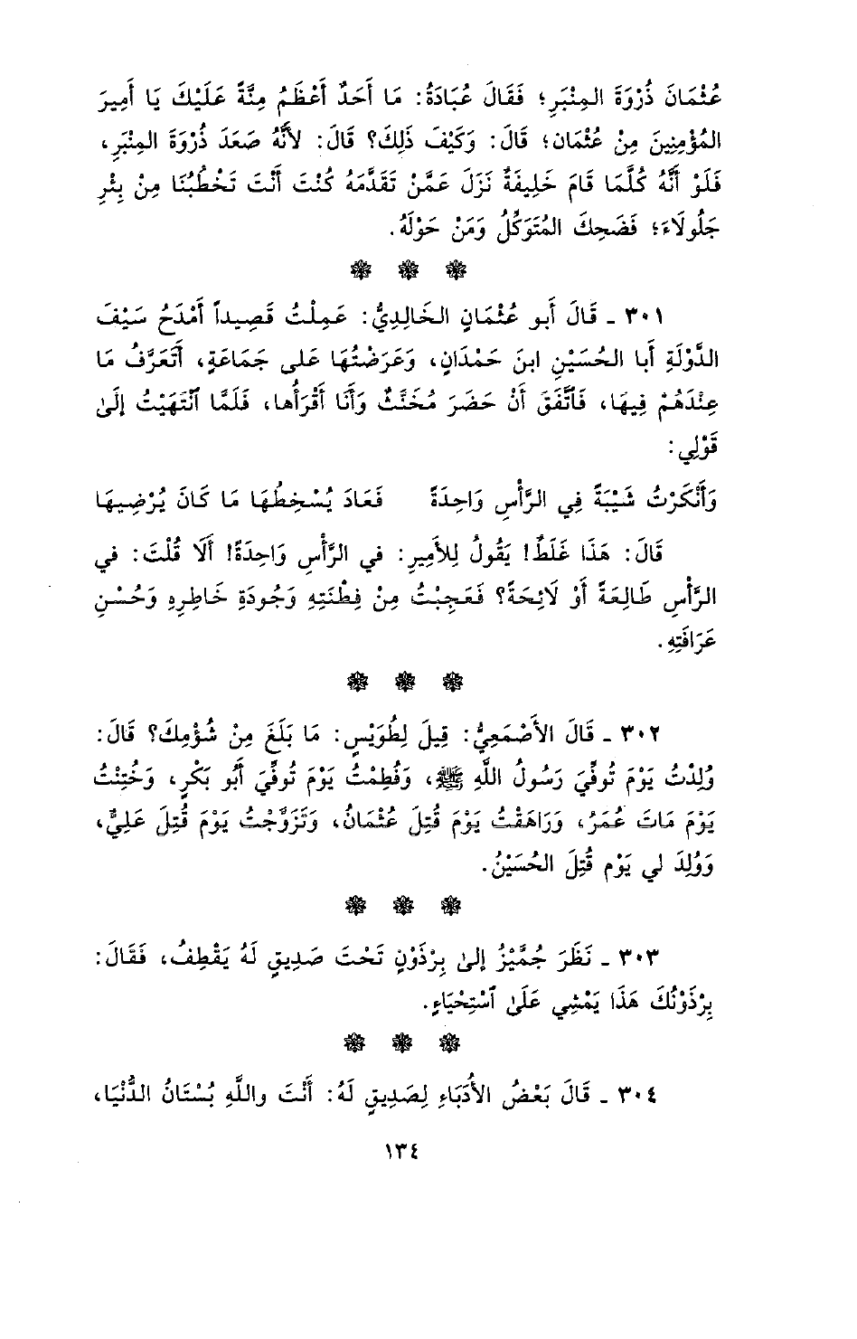 301 - قال أبو عثمان الخالدي: عملتُ قصيداً أمدح سيف الدولة أبا الحسين ابن حمدانٍ، وعرضتها على جماعةٍ، أتعرّف ما عندهم فيها، فاتّفق أن حضر مخنّثٌ وأنا أقرأها، فلمّا انتهيت إلى قولي: