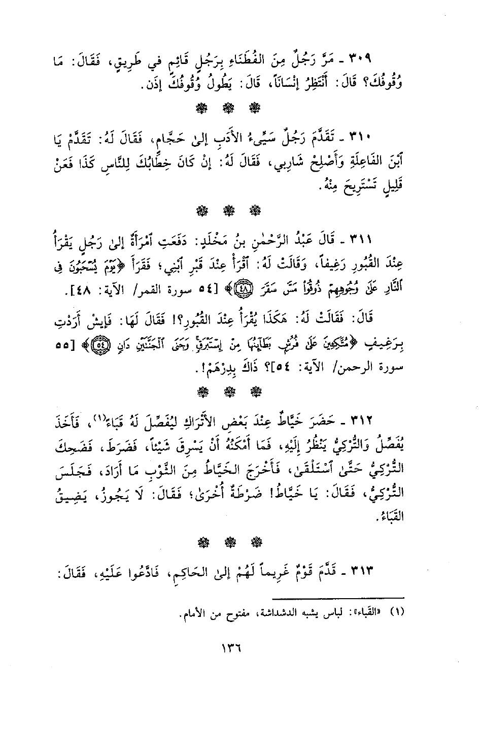 311 - قال عبد الرحمن بن مخلدٍ: دفعت امرأة إلى رجل يقرأ عند القبور رغيفاً، وقالت له: اقرأ عند قبر ابني؛ فقرأ {يوم يسحبون في النار على وجوههم ذوقوا مس سقر} [54 سورة القمر / الآية: 48] .