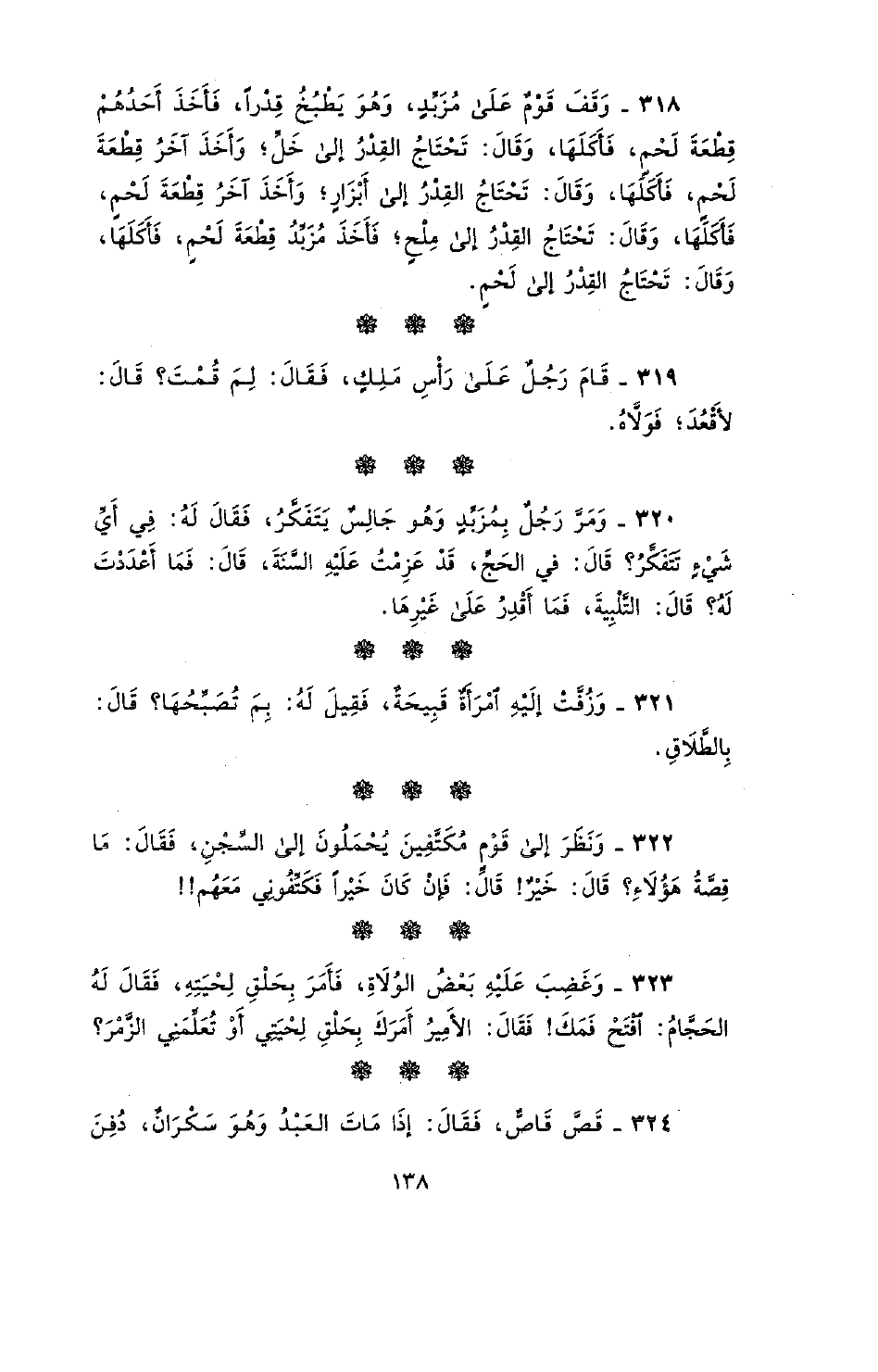 320 - ومرّ رجلٌ بمزبدٍ وهو جالسٌ يتفكر، فقال له: في أي شيءٍ تتفكر؟ قال: في الحج، قد عزمت عليه السّنة، قال: فما أعددت له؟ قال: التلبية، فما أقدر على غيرها.