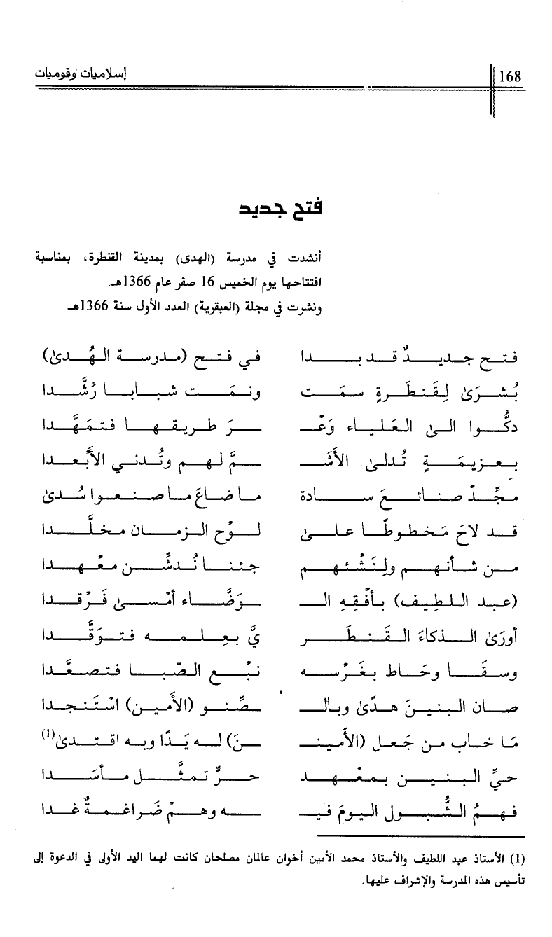 أنشدت في مدرسة (الهدى) بمدينة القنطرة، بمناسبة افتتاحها يوم الخميس 16 صفر عام 1366هـ.