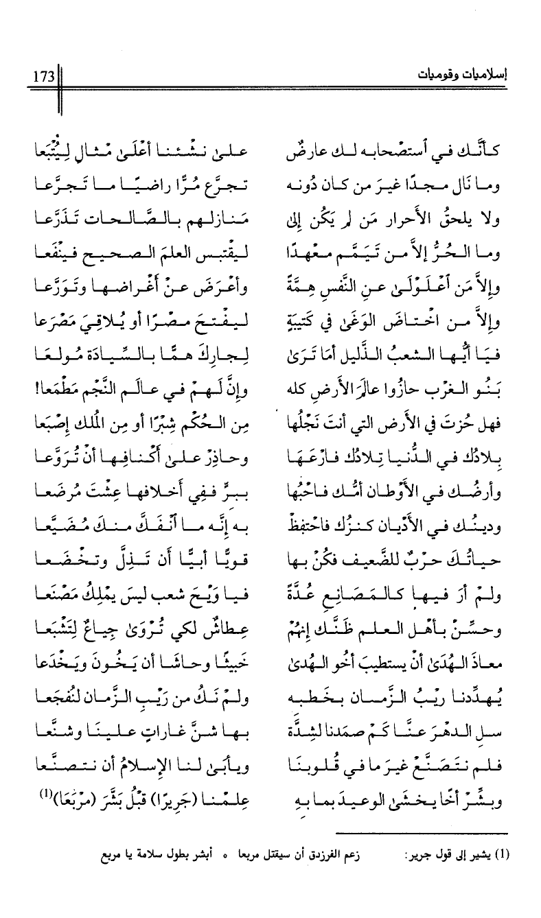 (1) يشير إلى قول جرير: زعم الفرزدق أن سيقتل مربعا …*… أبشر بطول سلامة يا مربع