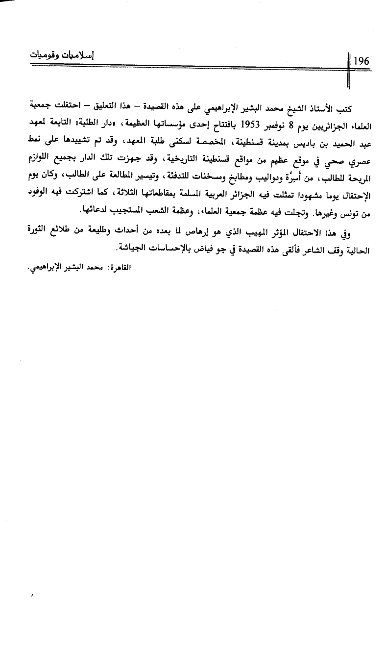 كتب الأستاذ الشيخ محمد البشير الإبراهيمي على هذه القصيدة- هذا التعليق- احتفلت جمعية العلماء الجزائريين يوم 8 نوفمبر 1953 بافتتاح إحدى مؤسساتها العظيمة، "دار الطلبة" التابعة لمعهد عبد الحميد بن باديس بمدينة قسنطينة، المخصصة لسكنى طلبة المعهد، وقد تم تشييدها على نمط عصري صحي في موقع عظيم من مواقع قسنطينة التاريخية، وقد جهزت تلك الدار بجميع اللوازم المريحة للطالب، من أسرة ودواليب ومطابخ ومسخنات للتدفئة، وتيسير المطالعة على الطالب، وكان يوم الإحتفال يوما مشهودا تمثلت فيه الجزائر العربية المسلمة بمقاطعاتها الثلاثة، كما اشتركت فيه الوفود من تونس وغيرها. وتجلت فيه عظمة جمعية العلماء، وعظمة الشعب المستجيب لدعائها.