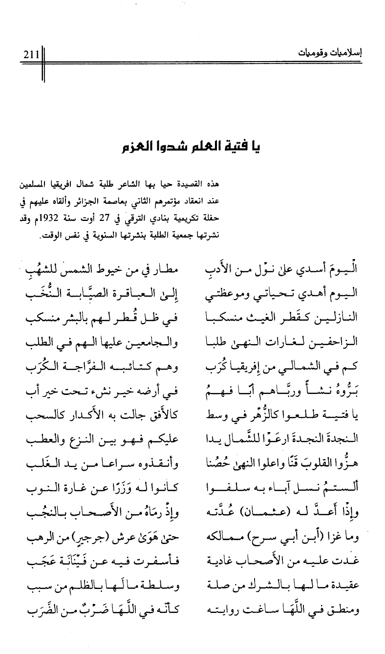 هذه القصيدة حيا بها الشاعر طلبة شمال افريقيا المسلمين عند انعقاد مؤتمرهم الثاني بعاصمة الجزائر وألقاه عليهم في حفلة تكريمية بنادي الترقي في 27 أوت سنة 1932م وقد نشرتها جمعية الطلبة بنشرتها السنوية في نفس الوقت.