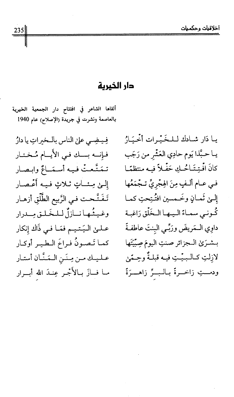 ألقاها الشاعر في افتتاح دار الجمعية الخيرية بالعاصمة ونشرت في جريدة (الإصلاح) عام 1940.