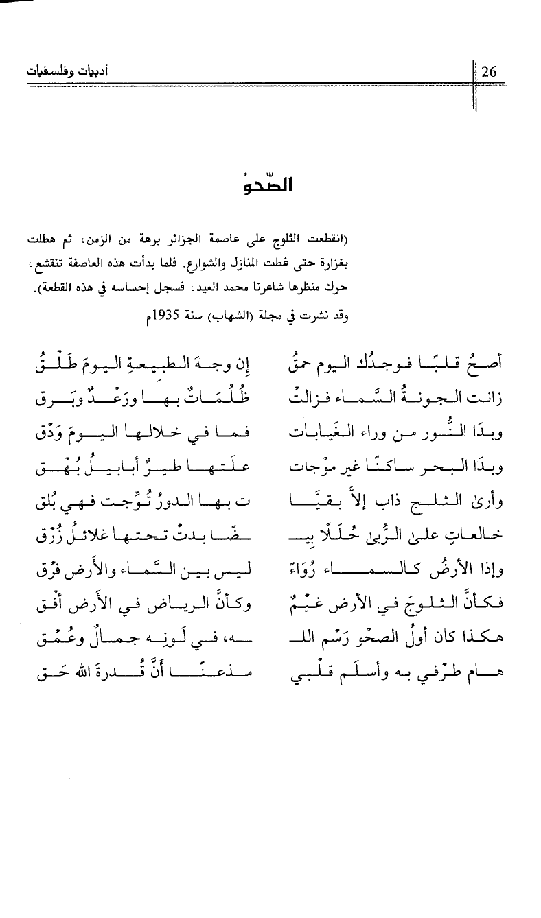(انقطعت الثلوج على عاصمة الجزائر برهة من الزمن، ثم هطلت بغزارة حتى غطت المنازل والشوارع. فلما بدأت هذه العاصفة تنقشع، حرك منظرها شاعرنا محمد العيد، فسجل إحساسه في هذه القطعة).