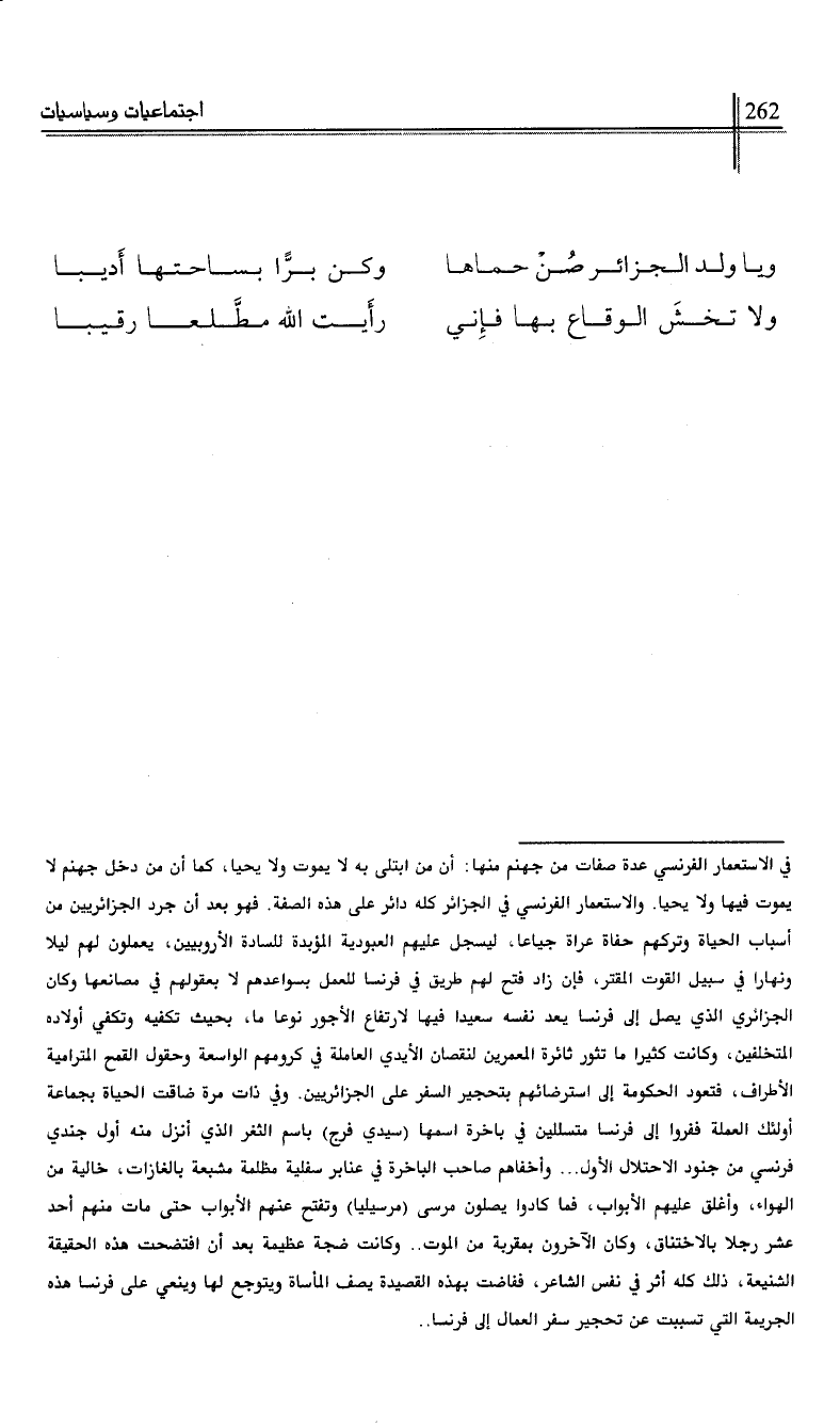 في الاستعمار الفرنسي عدة صفات من جهنم منها: أن من ابتلى به لا يموت ولا يحيا، كما أن من دخل جهنم لا يموت فيها ولا يحيا. والاستعمار الفرنسي في الجزائر كله دائر على هذه الصفة. فهو بعد أن جرد الجزائريين من أسباب الحياة وتركهم حفاة عراة جياعا، ليسجل عليهم العبودية المؤبدة للسادة الأروبيين، يعملون لهم ليلا ونهارا في سبيل القوت المقتر، فإن زاد فتح لهم طريق في فرنسا للعمل بسواعدهم لا بعقولهم في مصانعها وكان الجزانري الذي يصل إلى فرنسا يعد نفسه سعيدا فيها لارتفاع الأجور نوعا ما، بحيث تكفيه وتكفي أولاده المتخلفين، وكانت كثيرا ما تثور ثائرة المعمرين لنقصان الأيدي العاملة في كرومهم الواسعة وحقول القمع المترامية الأطراف، فتعود الحكومة إلى استرضائهم بتحجير السفر على الجزائريين. وفي ذات مرة ضاقت الحياة بجماعة أولئك العملة ففروا إلى فرنسا متسللين في باخرة اسمها (سيدي فرج) باسم الثغر الذي أنزل منه أول جندي فرنسي من جنود الاحتلال الأول …*… وأخفاهم صاحب الباخرة في عنابر سفلية مظلمة مشبعة بالغازات، خالية من الهواء، وأغلق عليهم الأبواب، فما كادوا يصلون مرسى (مرسيليا) وتفتح عنهم الأبواب حتى مات منهم أحد عشر رجلا بالاختناق، وكان الآخرون بمقربة من الموت .. وكانت ضجة عظيمة بعد أن افتضحت هذه الحقيقة الشنيعة، ذلك كله أثر في نفس الشاعر، ففاضت بهذه القصيدة يصف المأساة ويتوجع لها وينعي على فرنسا هذه الجريمة التي تسببت عن تحجير سفر العمال إلى فرنسا.