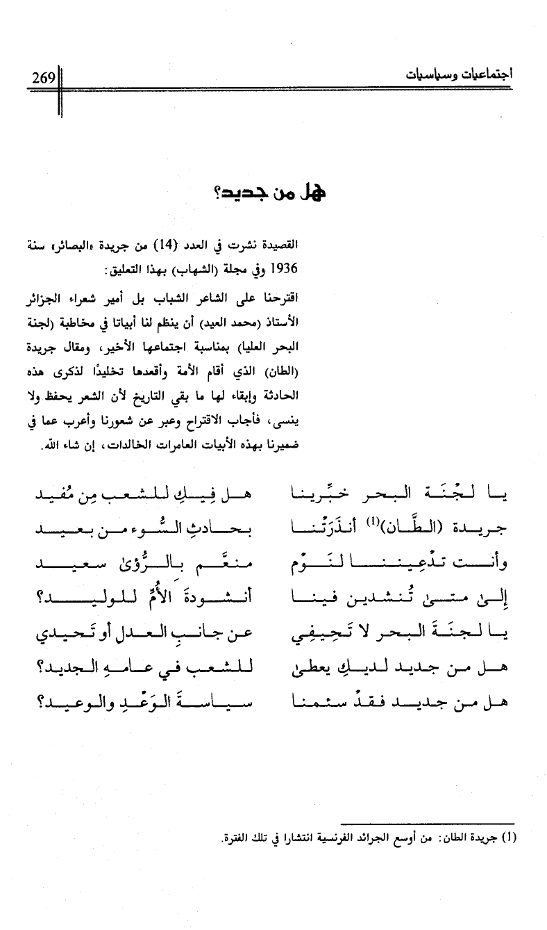 اقترحنا على الشاعر الشباب بل أمير شعراء الجزائر الأستاذ (محمد العيد) أن ينظم لنا أبياتا في مخاطبة (لجنة البحر العليا) بمناسبة اجتماعها الأخير، ومقال جريدة (الطان) الذي أقام الأمة وأقعدها تخليدا لذكرى هذه الحادثة وإبقاء لها ما بقي التاريخ لأن الشعر يحفظ ولا ينسى، فأجاب الاقتراح وعبر عن شعورنا وأعرب عما في ضميرنا بهذه الأبيات العامرات الخالدات، إن شاء الله.