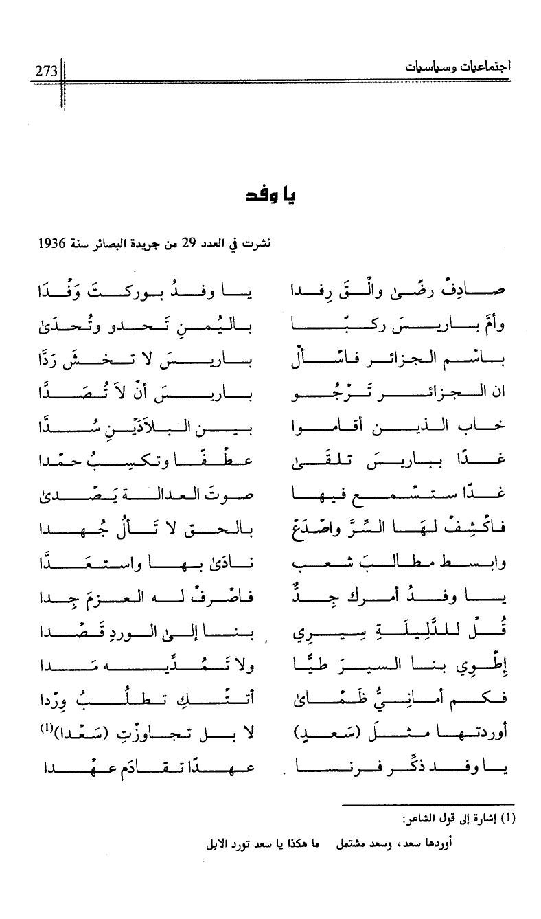 يا وفد ذكر فرنسا …*… عهدا تقادم عهدا