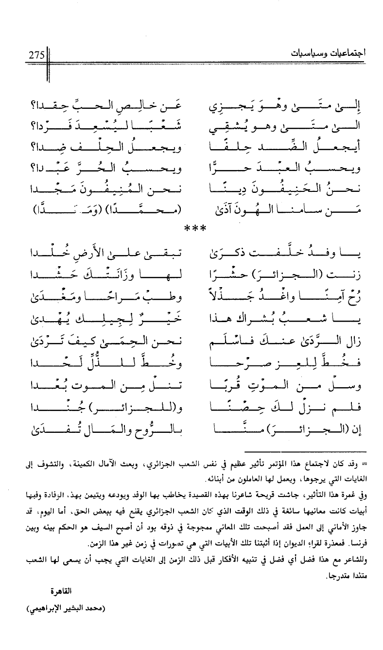وفي غمرة هذا التأثير، جاشت قريحة شاعرنا بهذه القصيدة يخاطب بها الوفد ويودعه ويتيمن بهذا الوفادة وفيها أبيات كانت معانيها سائغة في ذلك الوقت الذي كان الشعب الجزائري يقنع فيه ببعض الحق، أما اليوم، قد جاوز الأماني إلى العمل فقد أصبحت تلك المعاني ممجوجة في ذوقه بود أن أصبح السيف هو الحكم بينه وبين فرنسا. فمعذرة لقراء الديمان إذا أثبتنا تلك الأبيات التي هي تصورات في زمن غير هذا الزمن.