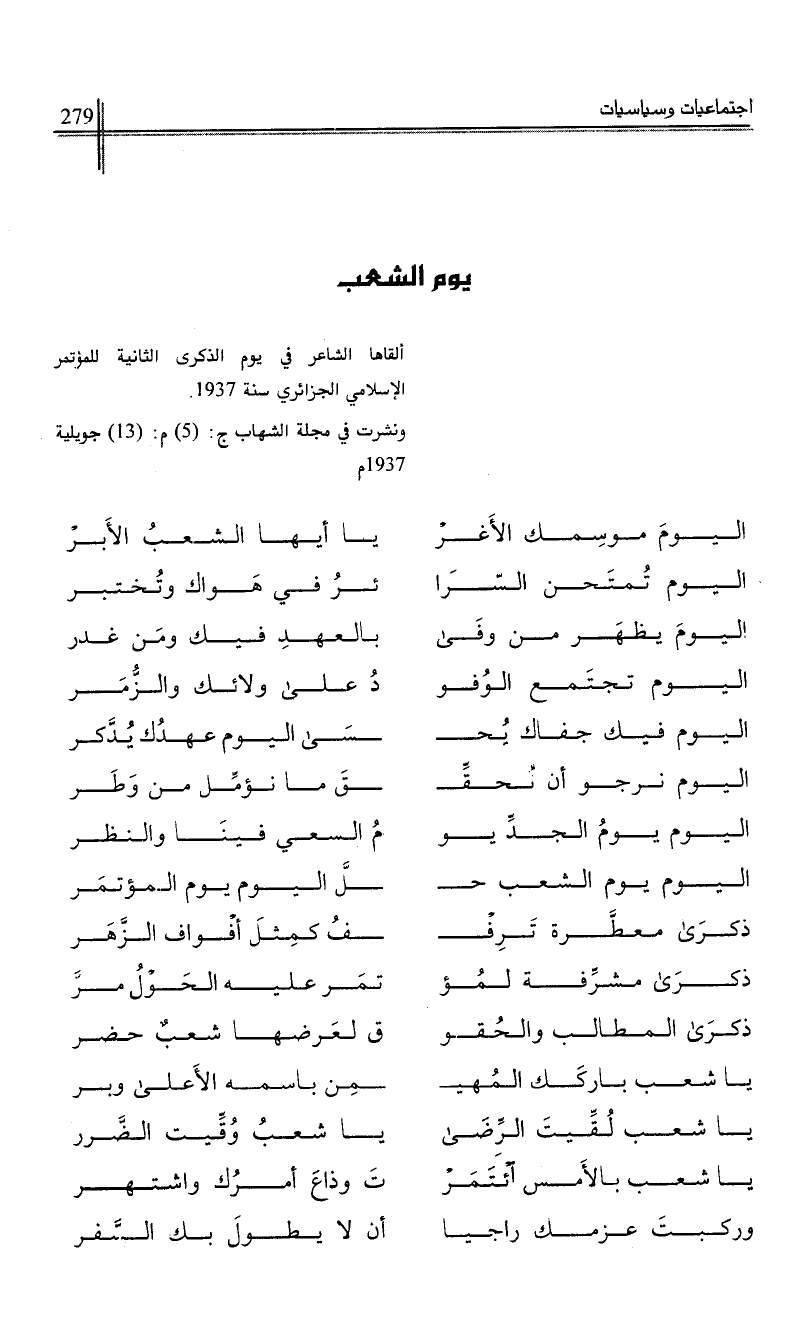 ألقاها الشاعر في يوم الذكرى الثانية للمؤتر الإسلامي الجزائري سنة 1937.