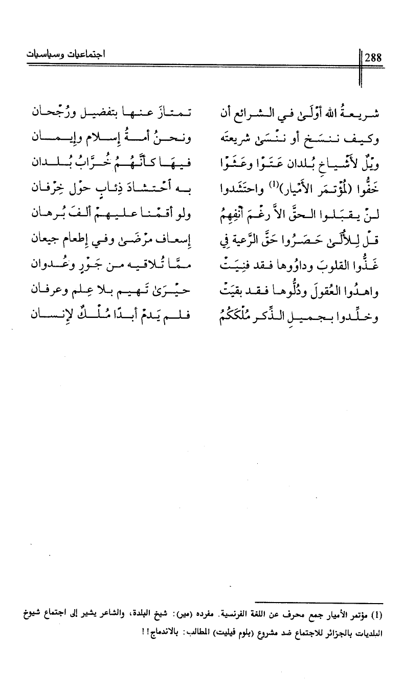 (1) مؤتمر الأميار جمع محرف عن اللغة الفرنسية. مفرده (مير): شيخ البلدة، والشاعر يشير إلى اجتماع شيخ البلديات بالجزائر للاجتماع ضد مشروع (بلوم فيليت) المطالب: بالاندماج!!
