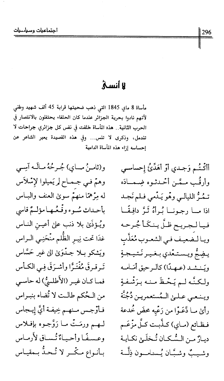 مأساة 8 ماي 1845 التي ذهب ضحيتها قرابة 45 ألف شهيد وطني لأنهم نادوا بحرية الجزائر عندما كان الحلفاء يحتفلون بالانتصار في الحرب الثانية .. هذه المأساة خلفت في نفس كل جزائري جراحات لا تندمل، وذكرى لا تنسى …*… وفي هذه القصيدة يعبر الشاعر عن إحساسه إزاء هذه المأساة الدامية.