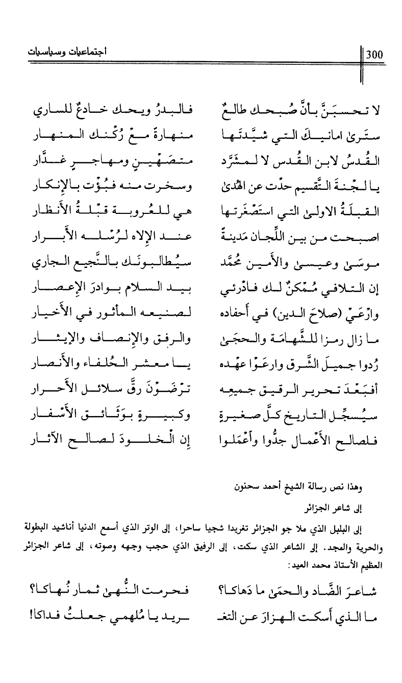 إلى البلبل الذي ملا جو الجزائر تغريدا شجيا ساحرا، إلى الوتر الذي أسمع الدنيا أناشيد البطولة والحرية والمجد، إلى الشاعر الذي سكت، إلى الرفيق الذي حجب وجهه وصوته، إلى شاعر الجزائر العظيم الأستاذ محمد العيد: