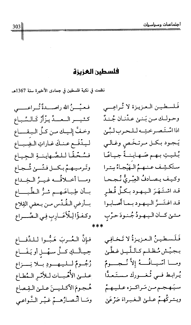 نظمت في نكبة فلسطين فى جمادى الأخيرة سنة 1367هـ