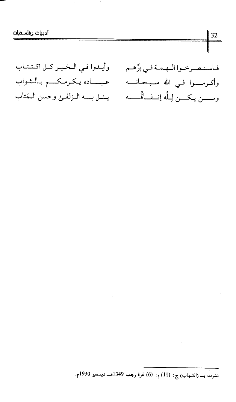 نشرت بـ (الشهاب) ج: (11) م: (6) غرة رجب 1349هـ ديسمبر 1930م.