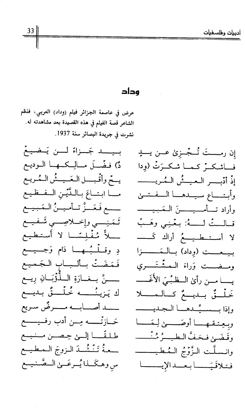 عرض في عاصمة الجزائر فيلم (وداد) العربي، فنظم الشاعر قصة الفيلم في هذه القصيدة بعد مشاهدته له.