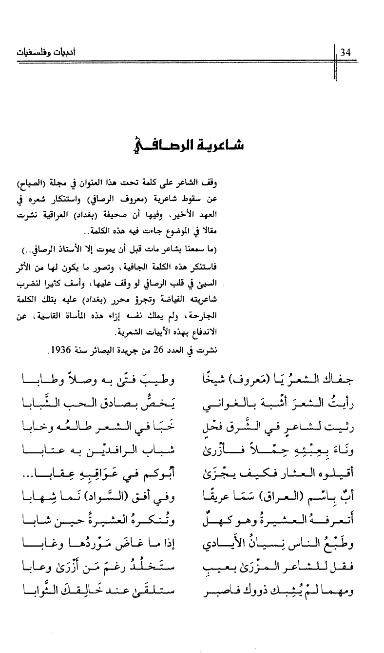وقف الشاعر على كلمة تحت هذا العنوان في مجلة (الصباح) عن سقوط شاعرية (معروف الرصافي) واستنكار شعره في العهد الأخير، وفيها أن صحيفة (بغداد) العراقية نشرت مقالا في الموضوع جاءت فيه هذه الكلمة .. (ما سمعنا بشاعر مات قبل أن يموت إلا الأستاذ الرصافي .. ) فاستنكر هذه الكلمة الجافية، وتصور ما يكون لها من الأثر السيئ في قلب الرصافي لو وقف عليها، وأسف كثيرا لنضرب شاعريته الفياضة وتجرؤ محرر (بغداد) عليه بتلك الكلمة الجارحة، ولم يملك نفسه إزاء هذه المأساة القاسية، عن الاندفاع بهذه الأبيات الشعرية.