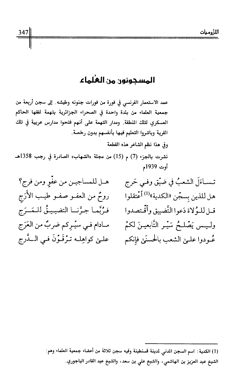 (1) الكدية: اسم السجن المدني لمدينة قسنطينة وفيه سجن ثلاثة من أعضاء جمعية العلماء وهم: الشيخ عبد العزيز بن الهاشمي، والشيخ علي بن سعد، والشيخ عبد القادر الياجوري.