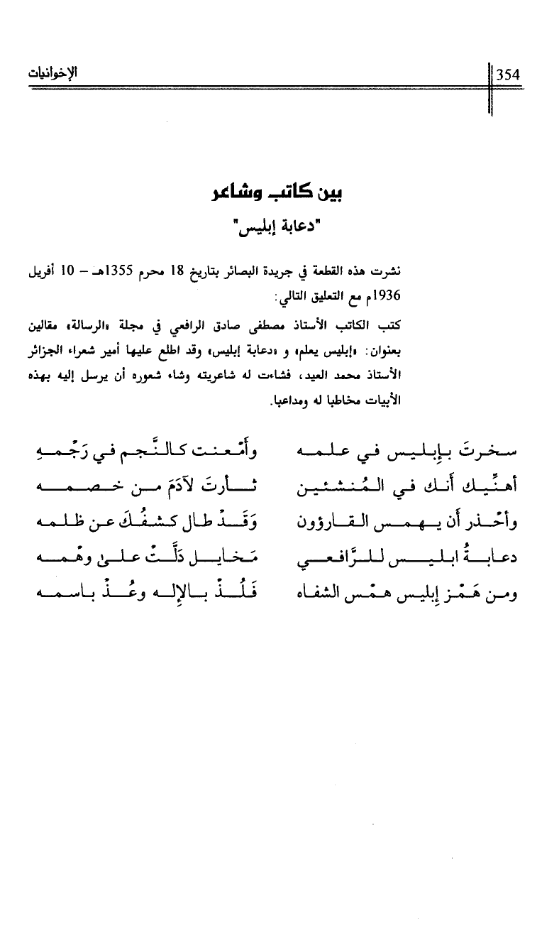 كتب الكاتب للأستاذ مصطفى صادق الرافعي في مجلة "الرسالة" مقالين بعنوان:"إبليس يعلم" و "دعابة ايليس" وقد اطلع عليها أمير شعراء الجزائر الأستاذ محمد العيد، فشاءت له شاعريته وشاء شعوره أن يرسل إليه بهذه الأبيات مخاطبا له ومداعبا.