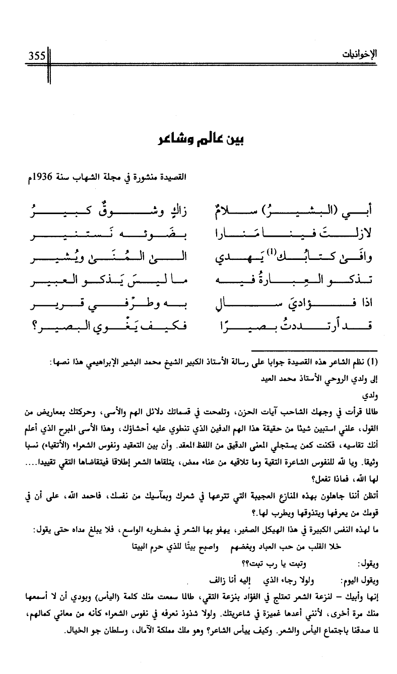 (1) نظم الشاعر هذه القصيدة جوابا على رسالة الأستاذ الكبير الشيخ محمد البشر الإبراهيمي هذا نصها.