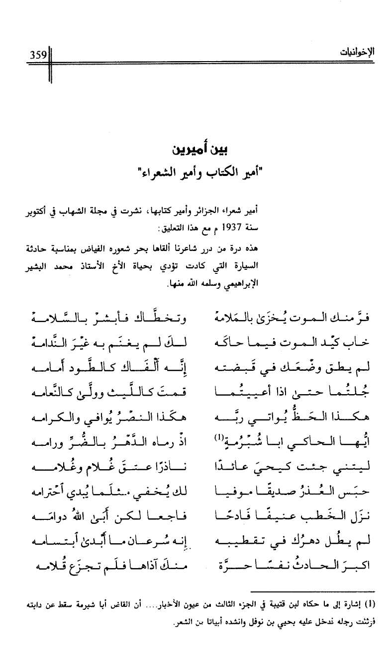 أمير شعراء الجزائر وأمير كتابها، نشرت في مجلة الشهاب في أكتوبر سنة 1937م مع هذا التعليق: